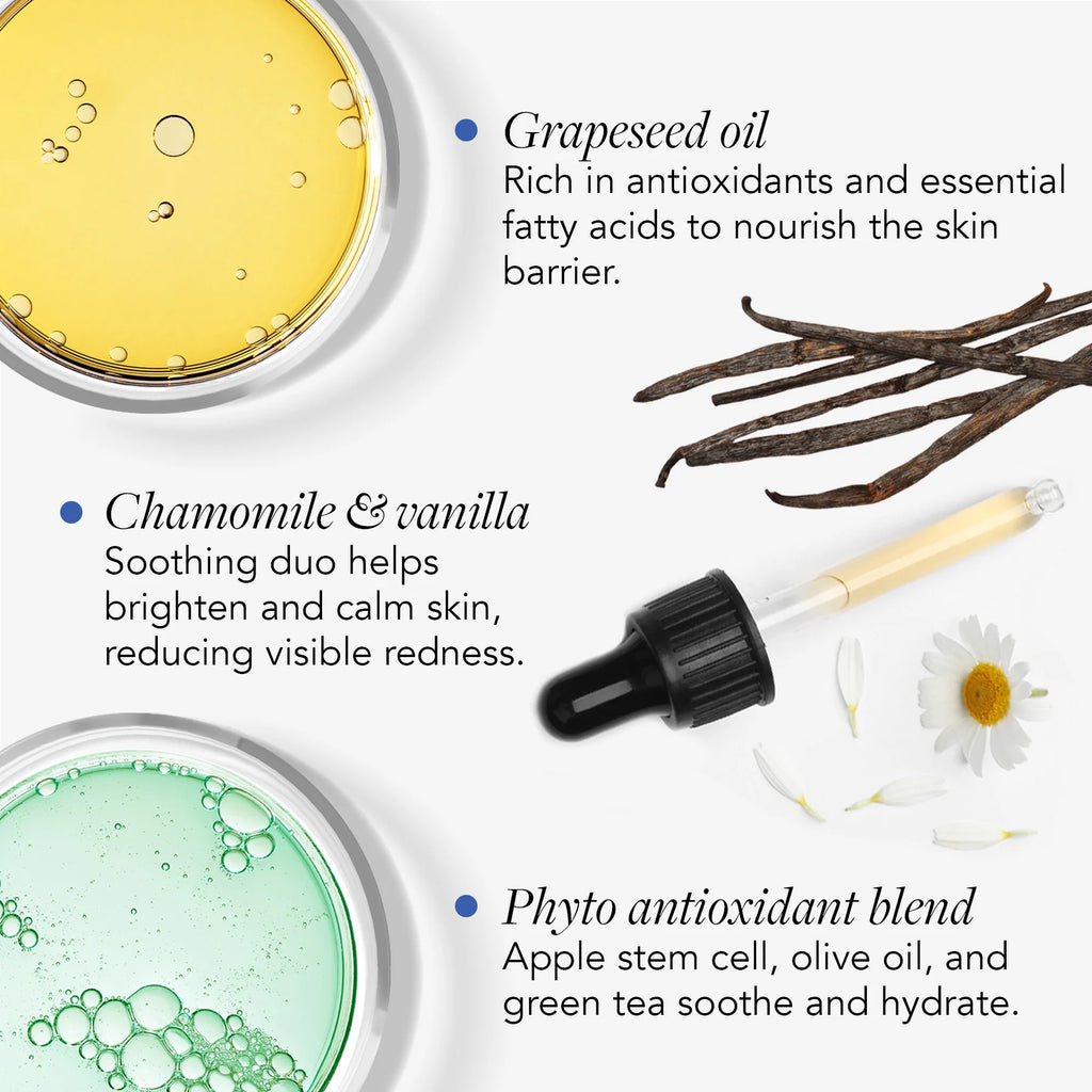This anhydrous cleanser features a calming hydration complex comprised of grapeseed oil rich in antioxidants and essential fatty acids, chamomile and vanilla which boast calming properties to help support the skin barrier and soothe visible redness.